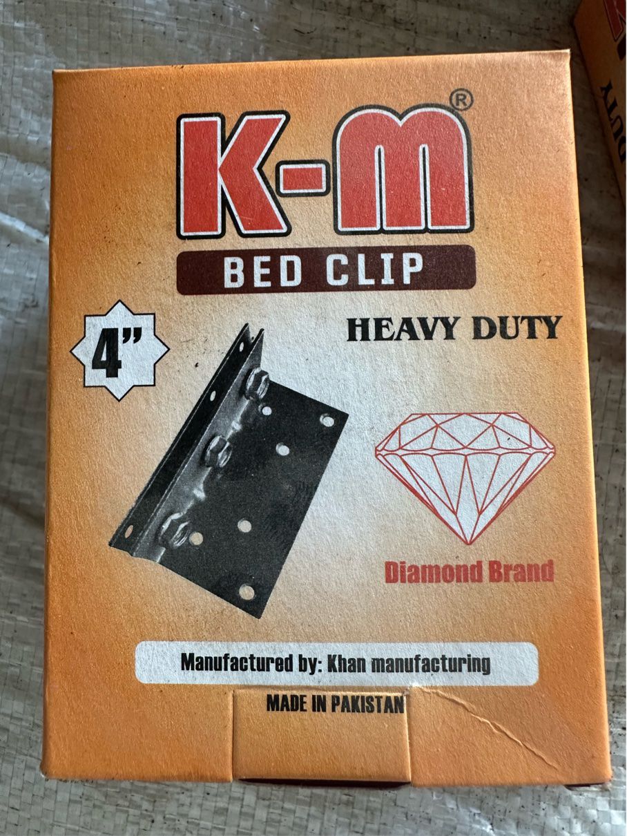 The images show K-M BED CLIPS (also referred to as bed clamps or brackets), which are heavy-duty metal hardware used to assemble and secure the rails of a bed frame.