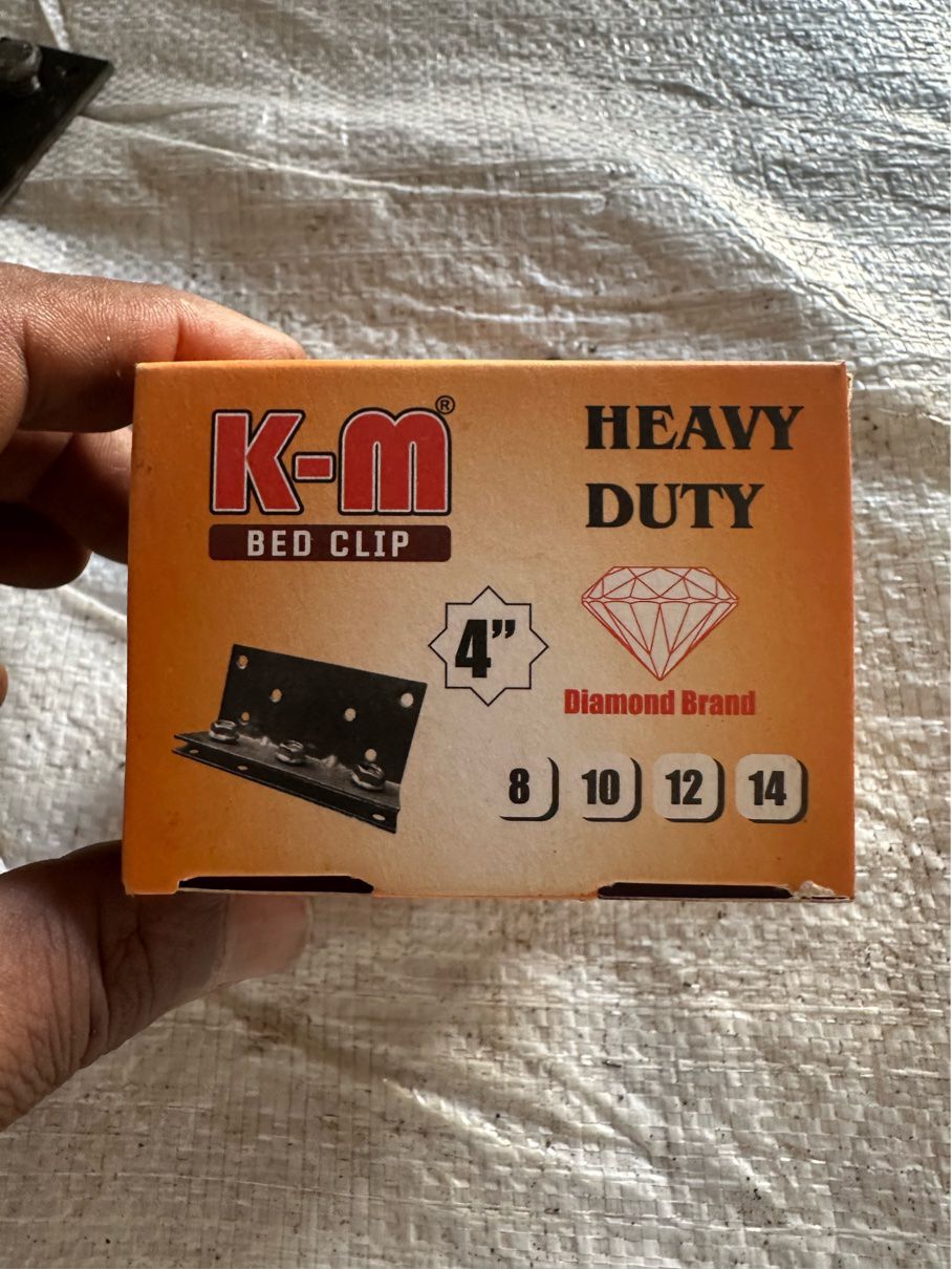 The images show K-M BED CLIPS (also referred to as bed clamps or brackets), which are heavy-duty metal hardware used to assemble and secure the rails of a bed frame.